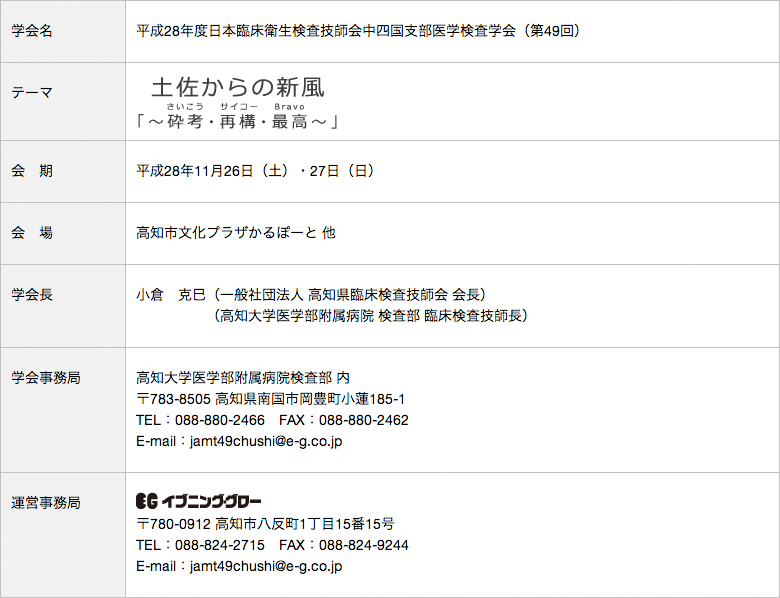 会期:平成28年11月26日(土)・27日(日)/ 会場:高知市文化プラザかるぽーと 他学会長:小倉克巳(一般社団法人 高知県臨床検査技師会 会長・高知大学医学部附属病院 検査部 臨床検査技師長)